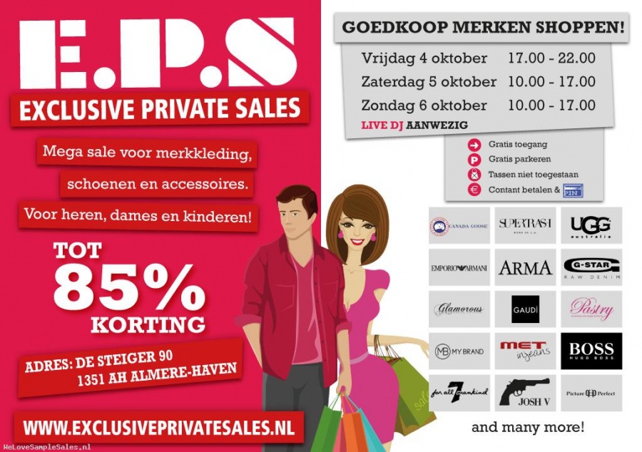 Exclusive Private Sales organiseert meerdere keren per jaar een Mega Sale. Onze klanten krijgen exclusief de mogelijkheid om o.a. diverse merkkleding, -schoenen en -accessoires voor dames, heren en kinderen aan te schaffen met kortingen die op kunnen lopen tot wel 85%.
