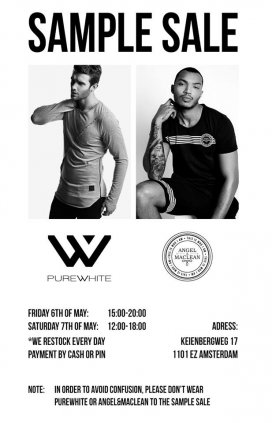 Sample sale van de merken Purewhite en Angel & Maclean. Er is dagelijke aanvulling. Draag aub geen kleding van deze merken tijdens de sale. Betalen kan met PIN of cash.