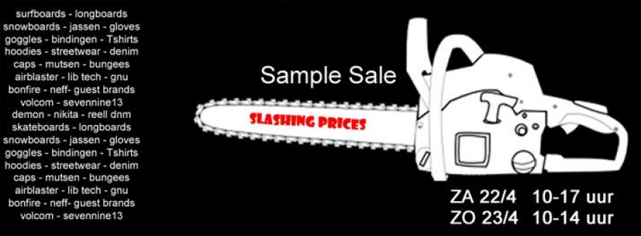 Sample sale van snowboard gear, slippers, surfboards, t-shirts, kleding en zonnebrillen van merken zoals Ashbury | Lib Tech | Venon surf | 32 boots | Airblaster | Nikita
