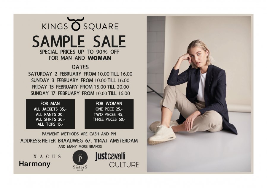Aankomend weekend, DE sample sale van KINGS SQAURE! Veel dames en heren items met 90% procent korting.