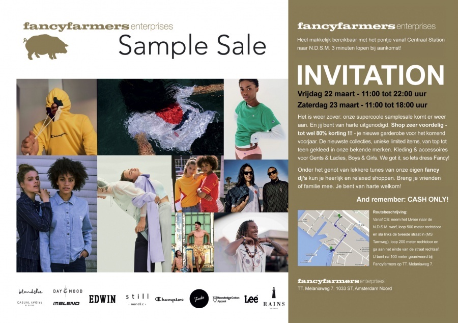 Het is weer zover: 22 en 23 maart a.s. komt onze supercoole Samplesale er weer aan! En jij bent van harte uitgenodigd. Shop zeer voordeling - tot wel 80% korting !! - je nieuwe garderobe voor het komend voorjaar. De nieuwste collecties, unieke limited items, van top tot teen gekleed in onze bekende merken. CHAMPION, RAINS, LEE jeans, EDWIN jeans, KNOWLEDGE COTTON, BLEND, BLEND SHE, CASUAL FRIDAY, BYONG, FRANSA, STILL NORDIC, DAY & MOOD. En we hebben nog wat mooie verrassingsmerken in petto als je langskomt.