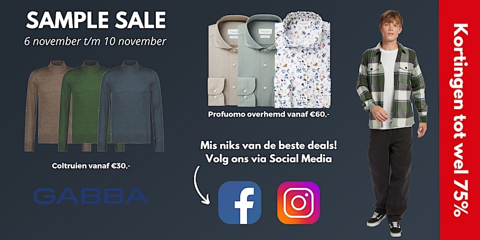 Sample sale van herenkleding van merken zoals Profuomo, Gabba, Carter & Davis, Neycko en meer