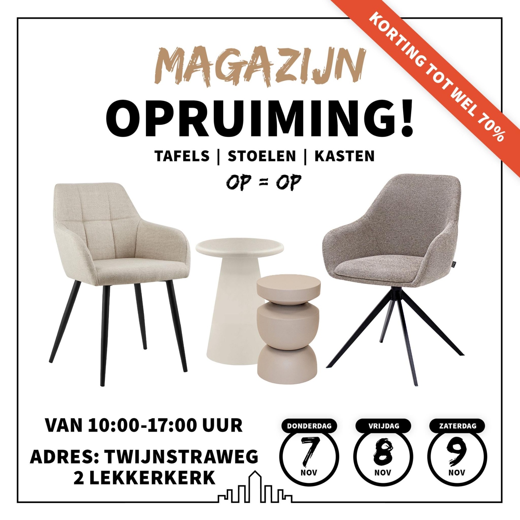 Magazijnverkoop georganiseerd door Kick Collection van tafels, stoelen en kasten. De items die verkocht worden zijn showroommodellen, retouren, proefmodellen en items doe de collectie verlaten.